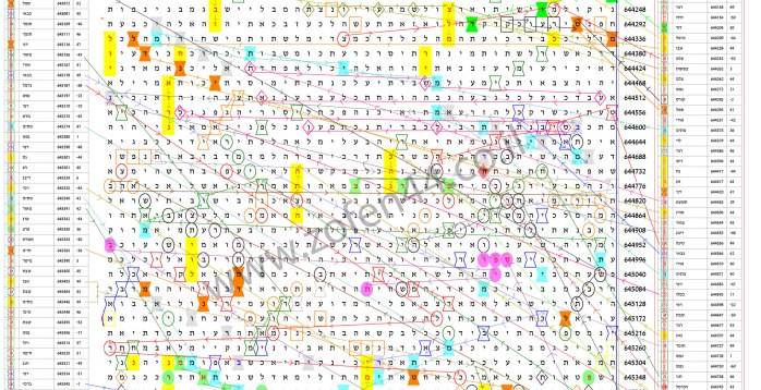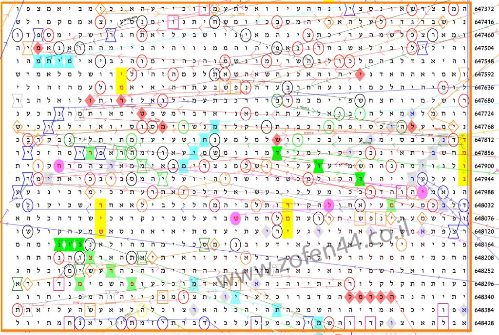המילה "מתים" (בצבע תכלת) מופיעה 6 פעמים בפיזור על כל מפת הצופן (645274,644375,644375,644571,644948,645340).כמו כן פרוסים שמות הנספים בדילוג נדיר של 44 אותיות.