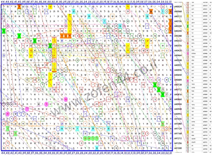 תפריט "המקרא" לאיתור המילים בצופן, המודפס מסביב לטקסט התנ"ך מופיע כך: מס' דילוג | מיקום המילה | המילה | סימון בצבע